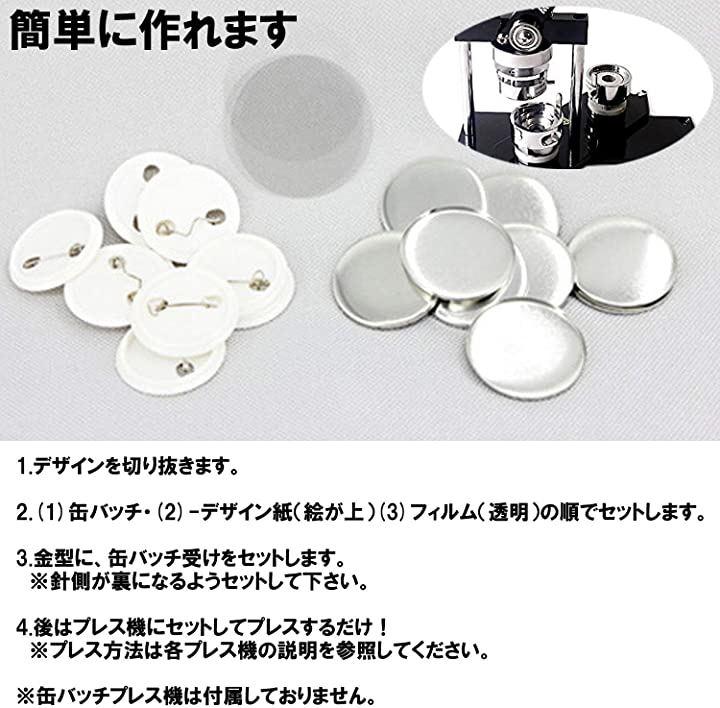 「セット内容」:缶バッジシェルx100、ピンバックx100、バッジフィルムx100