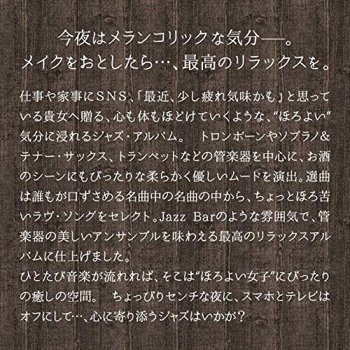 大好評の"ほろよいBar"シリーズ、前作「スウィート・ジャズ」に続いて、いよいよ第2弾のリリースです。本作はトロンボーンやソプラノ&テナー・サックス、トランペットなどの管楽器を中心に、ピアノやアコーステック・ギターを加え、柔らかく優しいムードを演出。お酒のシーンにもぴったりなJazz Barのような雰囲気で、管楽器の美しいアンサンブルを味わえる最高のリラックスアルバムに仕上げました。収録曲は、「美女と野獣(映画「美女と野獣」より)」、「ドント・ノー・ホワイ(ノラ・ジョーンズ)」、「ユア・ビューティフル(ジェームス・ブラント)」、「青春の輝き(カーペンターズ)」、「マイ・ハート・ウィル・ゴー・オン(セリーヌ・ディオン)」、など、誰もが口ずさめる名曲中の名曲の中から、ちょっぴりほろ苦いラヴ・ソングをセレクト。ひとたび音楽が流れれば、そこは"ほろよい女子"にぴったりの、癒しの空間。 ちょっぴりセンチな夜に、スマホとテレビはオフにして…、心に寄り添うジャズはいかが?