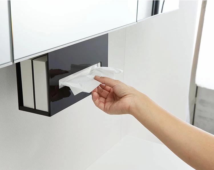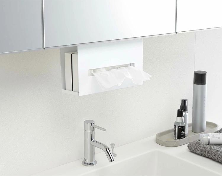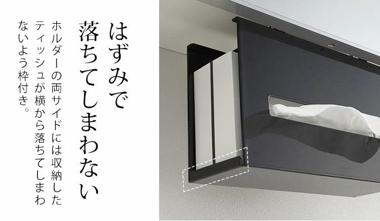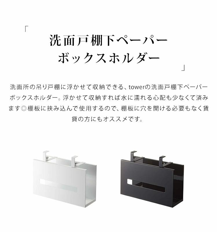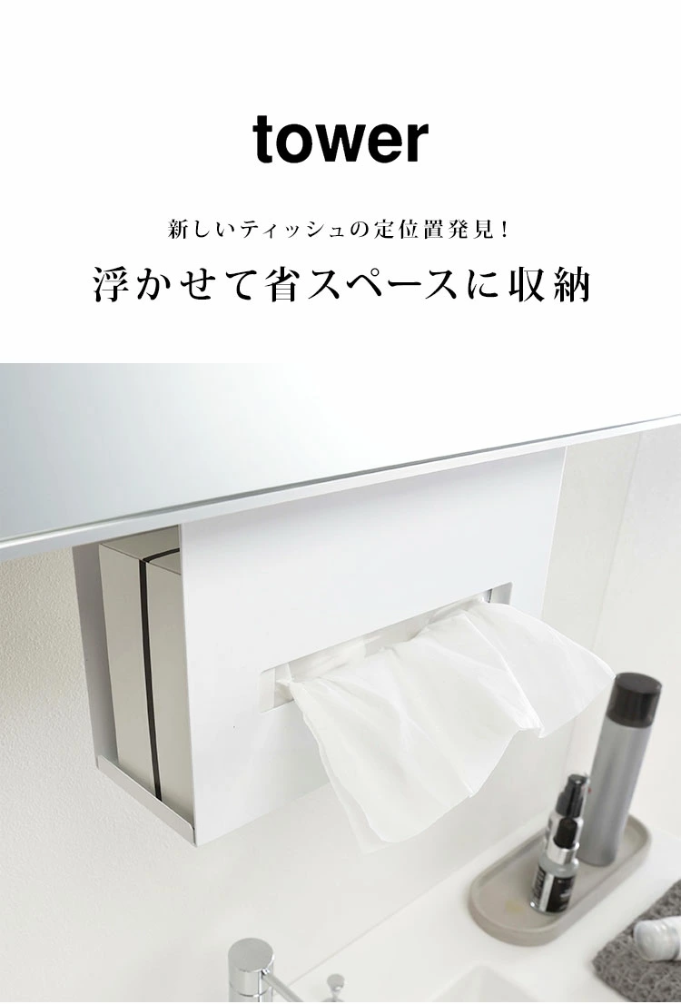 【洗面戸棚下ペーパーボックスホルダー】洗面所の吊り戸棚に浮かせて収納できる、towerの洗面戸棚下ペーパーボックスホルダー。浮かせて収納すれば水に濡れる心配も少なくて済みます◎棚板に挟み込んで使用するので、棚板に穴を開ける必要もなく賃貸の方にもオススメです。