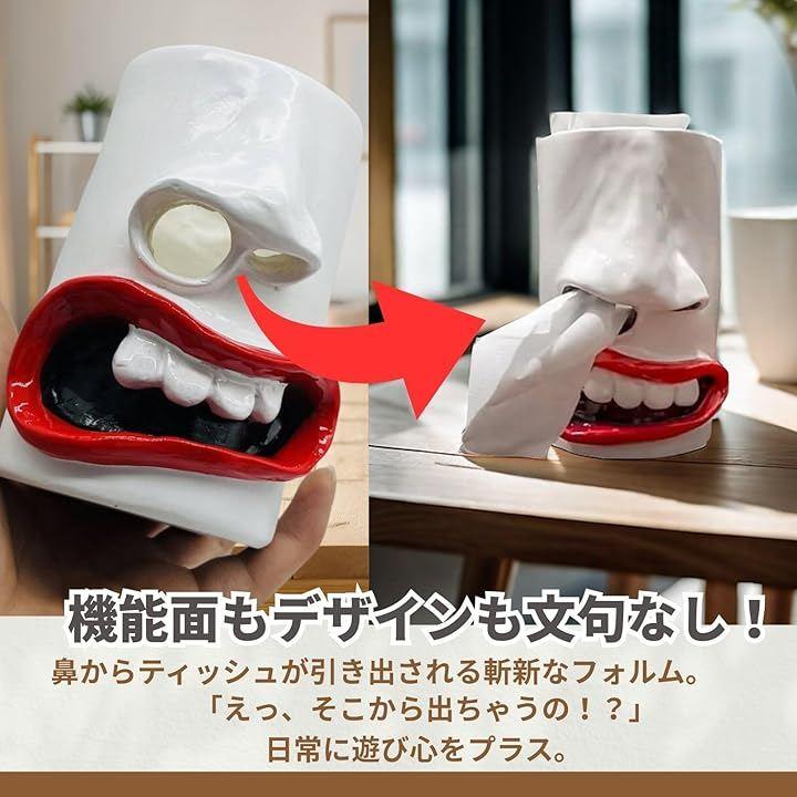 「思わず笑顔になるユニークフェイスデザイン」 白い顔に立体的な鼻と大きな口を組み合わせ、鼻の穴からティッシュが出てくる遊び心あふれるデザインが特徴です。