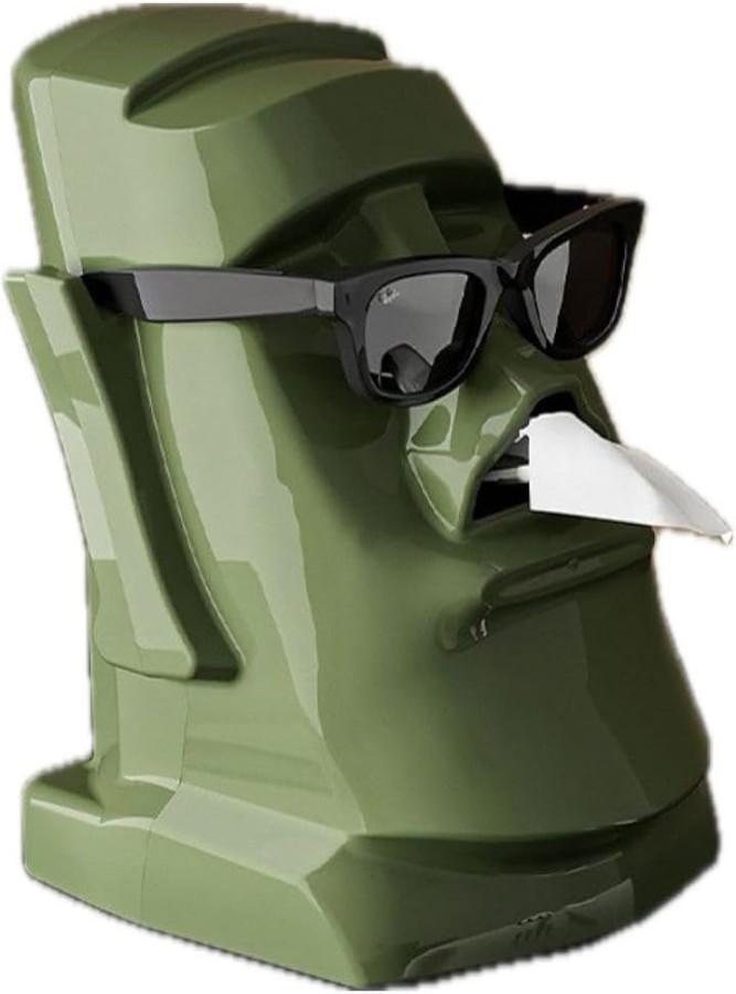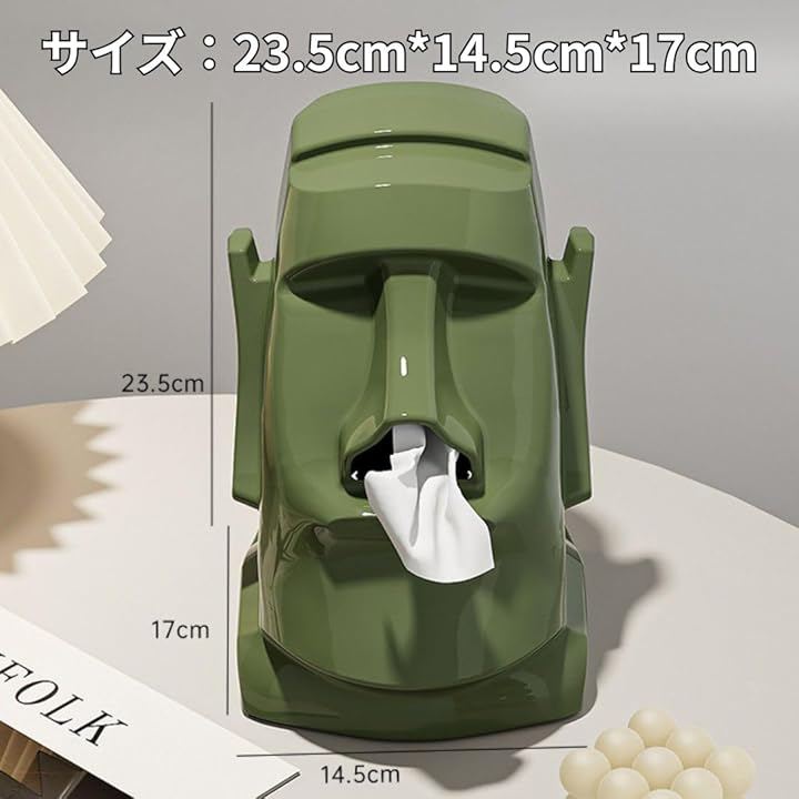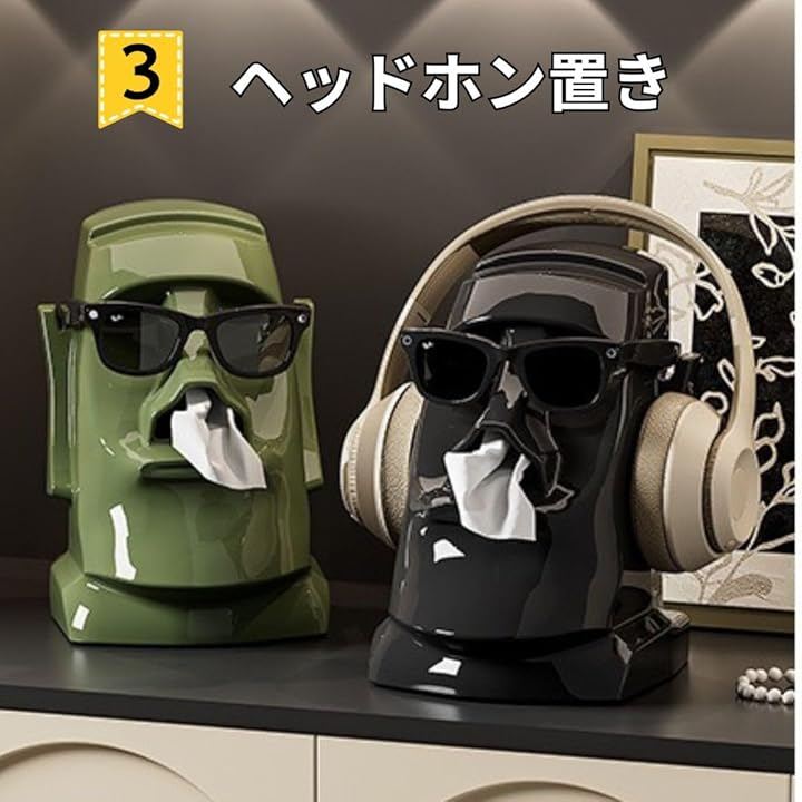 モアイ像の形をしたティッシュケースは、アートと実用性を兼ね備えており、ティッシュの取り出しがスムーズにできる便利なアイテムです。