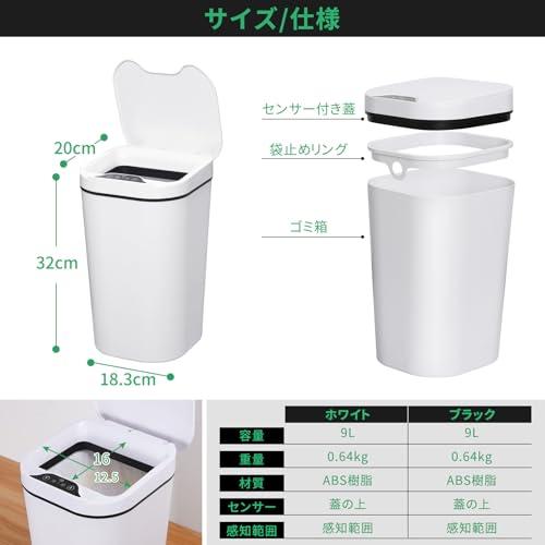 センサー付きでスマートになれ:蓋に「人感反応センサー/振動センサー」が搭載されています。手をかざすなどしてセンサーが検知すると、足で軽くけるだけで、自動でフタをオープンします。センサーの感知範囲外になると開いたフタは5秒後(LEDランプが5回黄色に点滅)に自動的に閉じます。両手がふさがっている場合でも、手を伸ばすだけで簡単にゴミを捨てられる。ゴミ箱に触る必要がなく衛生的です。自動開閉のほかに手動押ボタンでの開閉や、開けっ放しにすることも可能。センサーの感知距離は6cm~30cmの範囲で、カウンターの下など上部に障害物がある場所にも置くことができます。毎日の生活をもっと快適にします。 コンセント不要の電池式&ゴミ袋が外から見えない:単3電池2本でコードレス、キッチンに、リビングに、洗面所に好きな場所にどこでも置けます。コンセントケーブルがない分、すっきりとした空間になります。通常の使用で約4カ月間使えますので、電気代もお財布に優しいです。また、引っ掛けリングの四隅のツメにゴミ袋を取り付け、サイドの穴に余った袋のフチを差し込み、たわみが無くなるまで引っ張り出して、ピタッとセットするだけ。正しく取り付ければ、外から袋が見えずスッキリ。外からゴミ袋が見えたりしませんので、生活感を感じさせません。※電池は入っていません。お客様にてご用意ください。※ 静音設計&密閉設計のフタ:蓋の開閉時に発生する音を最小限に抑えた静音設計。夜間でも周りを気にせずにご使用いただけます。密閉構造により、生ゴミやペットの排泄物などの不快な臭いをしっかりと封じ込め、室内の空気を常に新鮮に保ちます。害虫の侵入防止とゴミの飛散防止にも役に立ちます。 省スペースでスタイリッシュなデザイン:サイズ→幅18.3×奥行20×高さ32cm 容量:9L、スリムでコンパクトなデザインにより、狭い場所でもスッキリと収まります。また、シンプルなデザインで、どんなインテリアにも馴染みやすい。キッチンやリビングの他、オフィスや洗面所でも場所を取らずにお使いいただけます。 サポートについて:TIXPOLの商品は全て2年間の保証期間が付きます。商品の品質には自信を持っていますが、万が一商品不具合である場合、交換または返品返金に対応させていただきます。ご利用中に何かご問題がございましたら、いつでもご気軽にお問い合わせください。
