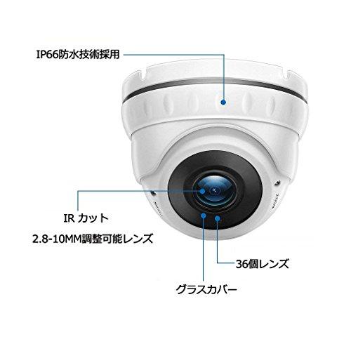 「200万の高画素」高画質の200万画素に加え、2.8-10mmの手動調整可能レンズで、人や物の様子がはっきり見られます。(本機はAHD1080Pの物で、購入する前はレコーダーが対応できるかどうかを予め確認して下さい)「赤外線LED36個搭載」36個の赤外線LEDは夜の監視効果に役に立ち、赤外線照射距離は30mに達します。明暗センサー内蔵で暗くなると自動的に赤外線ライトが発光し威嚇効果が発揮します。「IP66防水技術採用」防水防塵で、屋外の設置も大丈夫です。金属製のカバーは壊れにくく、使用寿命が伸ばします。「IR CUT内蔵」光不足の場合(夕方、逆光とか)、映像が鮮明的撮影されます。「保証期間:2年」購入する二年間、何か品質問題とかがございましたら、当店にご連絡いただきますようお願いいたします。?もっと見る