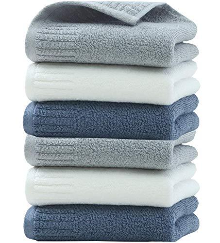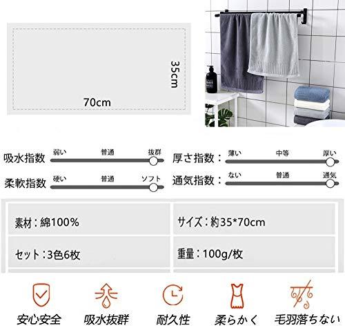 【フェイスタオル 6枚セット】素材:綿100%、サイズ:約35×70cm、重さ:約100g(1枚)、セット内容: ホワイト2枚 、ブルー2枚、グレー2枚。【厳選された綿100%の素材】素材は綿100%です。染色堅牢度は4級に達し、色移りや毛羽落ちがなく、何回洗濯しても変形しなくて、超長持ちタイプです。おしゃれでかわいいデザインだけではなく、タオルは厳しい審査をクリアしておりますので、においがありません、蛍光染料不使用で、赤ちゃんや敏感肌の方にも安心してご使用頂けます。【瞬間吸水&速乾】素材の表面は数えられない隙間があり、その隙間に大量の水分を素早い吸水できます。吸水力は普通のタオルより何倍もあり、吸水性が抜群で瞬間吸水します。乾き早いの特徴は注目されるポイントです、湿気による細菌の増殖を抑えられます。洗濯物を乾きにくい時期にも快適で使えます。【多用途】35cm X 70cmのサイズは家庭用、ホテル、業務用、スポーツなどにも最適。出張、旅行、入浴、ご家族皆さんが満足できます、様々な場合で活躍。お手頃プライスなので、引越しのごあいさつ、上司や取引先へのお礼、友達の出産祝い、誕生日プレゼントなどにも最適です。【使用方法】新しいタオルは洗浄してから使用してください。皮膚の損傷を避けるために漂白剤を使用しないでください。 斑点を防ぐため、またはさまざまな細菌の繁殖を防ぎ、タオルの寿命を延ばすために、タオルは換気の良い乾燥した場所に置く必要があります。予備タオルの数は3 ~ 4枚にすることをおすすめします。