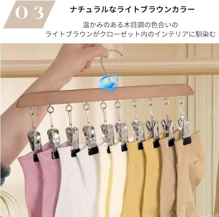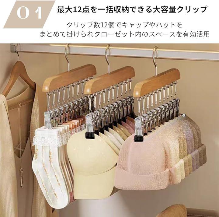 「最大12点を一括収納できる大容量クリップ」クリップ数12個でキャップやハットをまとめて掛けられ、クローゼット内のスペースを有効活用。