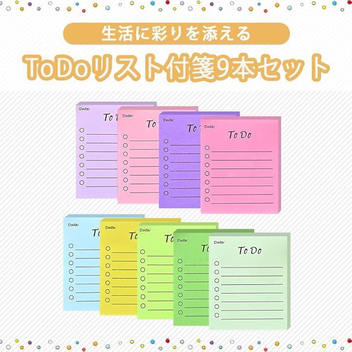 「商品詳細」ToDoリスト付箋9本セット、入数:9、サイズ:画像参照、カラー:9冊セット、ピンク、緑、薄紫、蛍光緑、薄緑、青、ローズレッド、黄色、紫、素材:紙