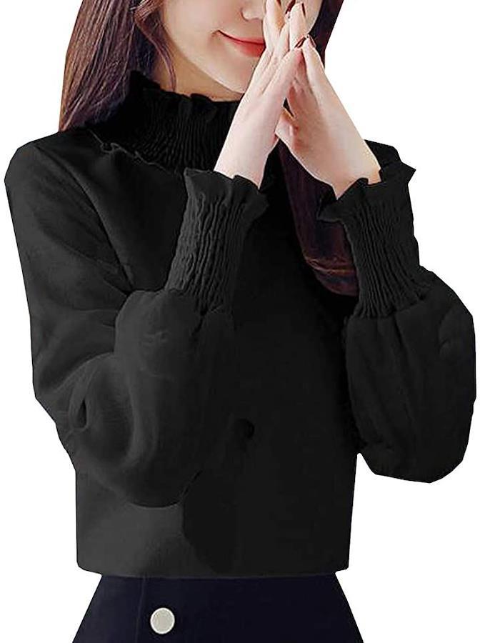 シンプルなボディにえりや袖口のさりげないフリルがかわわい清楚なハイネックプルオーバーブラウス。