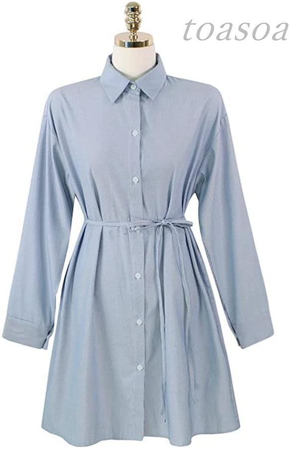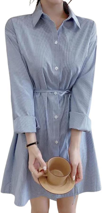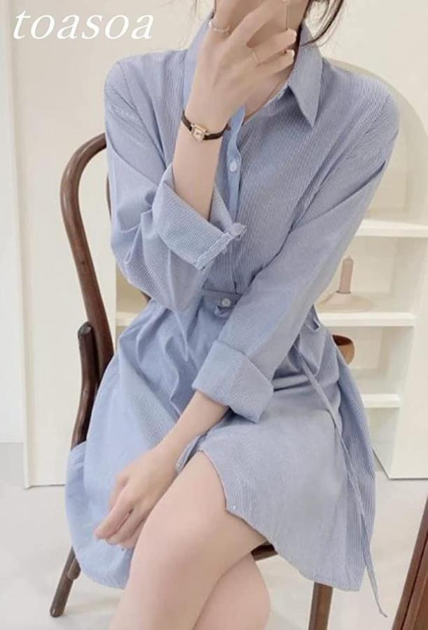 ・流行のブルー ストライプが大人かわいい抜け感のある ざっくり シャツワンピです。
