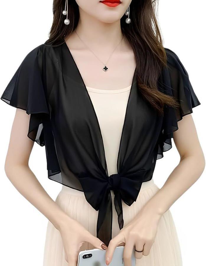 さっと羽織れる軽さが魅力のシフォン フリル リボン ボレロ。