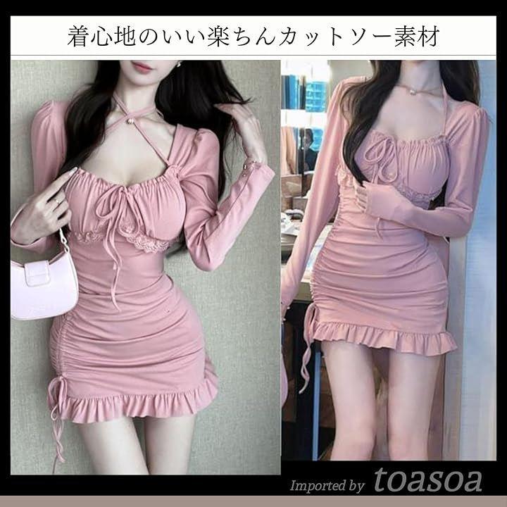 胸元にクシュっとギャザー フリルとリボンが大人可愛くセクシーなミニ ワンピです。