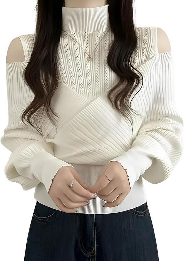 ノースリハイネックとカシュクールニットをレイヤードしたような 長袖 ニット プルオーバー。