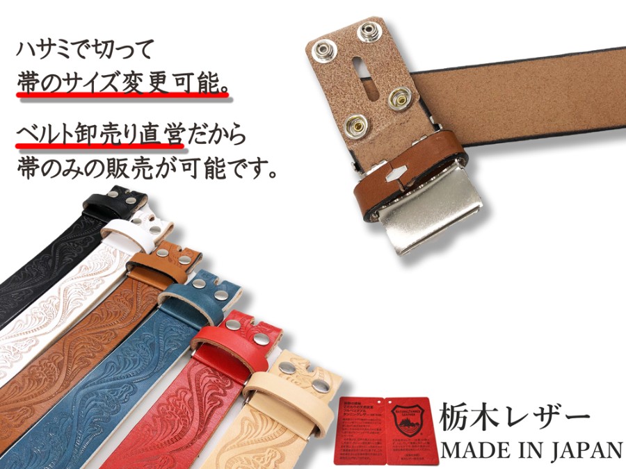バックルは別売りの帯のみの販売になります。サイズ調節も簡単にできるため男女問わず支持していただいているアイテム。革にこだわりつつも、様々なバックルで楽しめるよう汎用性高い機能を盛り込み、しっかりとした革で高級感があり、長年使える定番の一本になってくれる商品です!