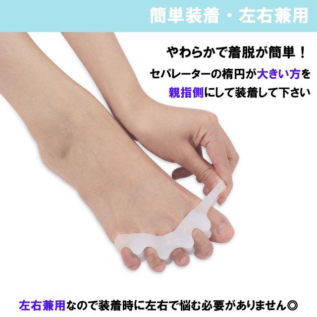 足の指を最適な感覚で開き、正しい位置へと補正する足指セパレーターです。外反母趾・内反小趾・ハンマートゥの矯正、足の疲労、むくみ・冷えなどの予防対策として様々なお悩みをサポートします!伸縮性があり耐久力のあるシリコン製なので毎日の使用も安心。やわらかでよく伸びるので装着も簡単。左右兼用なので装着時に左右で悩む必要がありません◎足指に絶妙にフィットしずれにくく、装着後靴下や靴を履いても大丈夫なので外出時も着用できます。日常に取り入れやすく毎日気軽に装着いただけ、足指を開くことで足裏のバランスを整え、負担を軽減します。
