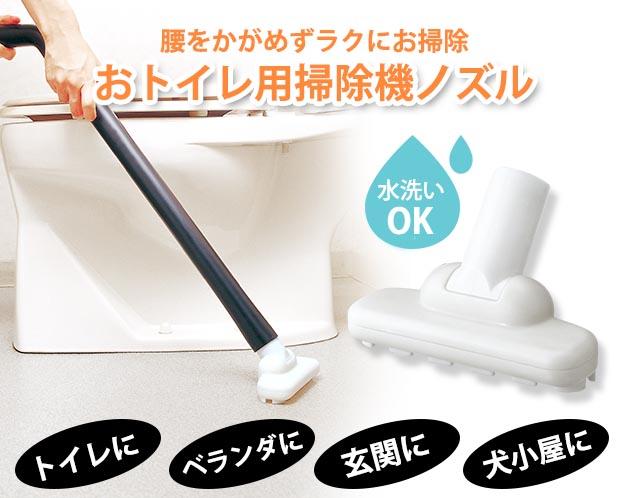 ★環境に優しい、土に還る樹脂で作ったおトイレ用掃除機ノズル!!*腰もかがめずラク~にキレ~におトイレ掃除!!おトイレも掃除機なら腰もかがめず楽にキレイに掃除が出来るんだけど、お部屋掃除の掃除機を使用するのは不衛生でイヤ!!そんな箇所のお掃除におトイレ用掃除機ノズル、お部屋掃除の掃除機ノズルと取替えておトイレ・ベランダ・玄関のお掃除にご使用下さい。*おトイレ用掃除機ノズルは、環境にやさしい樹脂として関心が高まる生分解性樹脂(植物由来の土に還る)で作った環境にも配慮した掃除機ノズル。水洗いOK、何時でも清潔にご使用頂けます。*ネック部は角度調節可能(2段階)。ご使用後、本体は、パイプ上部の穴(直径5mm)にフックなどで引っ掛けて収納することが出来ます。*生分解性樹脂は、再生可能な植物由来の樹脂で、自然環境下(土中・水中など)で水と炭酸ガスに完全に分解されます。又、焼却した場合も地球温暖化の原因である二酸化炭素(CO2)の発生量も少なく、ダイオキシン等の有毒ガスや異臭も発生しない、自然環境に優しい樹脂です。