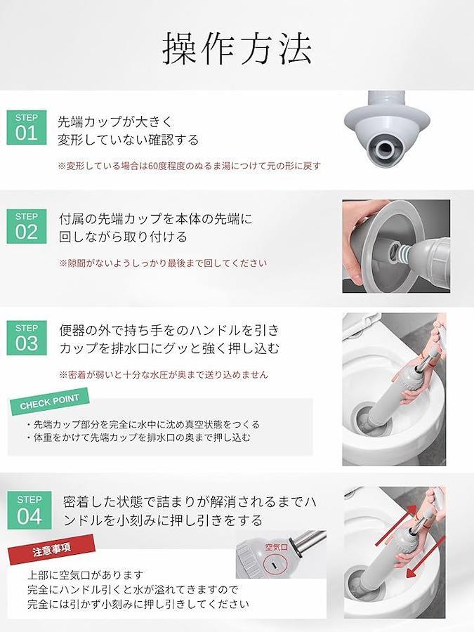 「すぐにつまりを解消」(1)先端カップが大きく変形していないか確認し、本体の先端に取り付ける(2)便器の外で持ち手のハンドルを引き、すっぽんを便器の奥の方へグッと強く押し込みセットする。