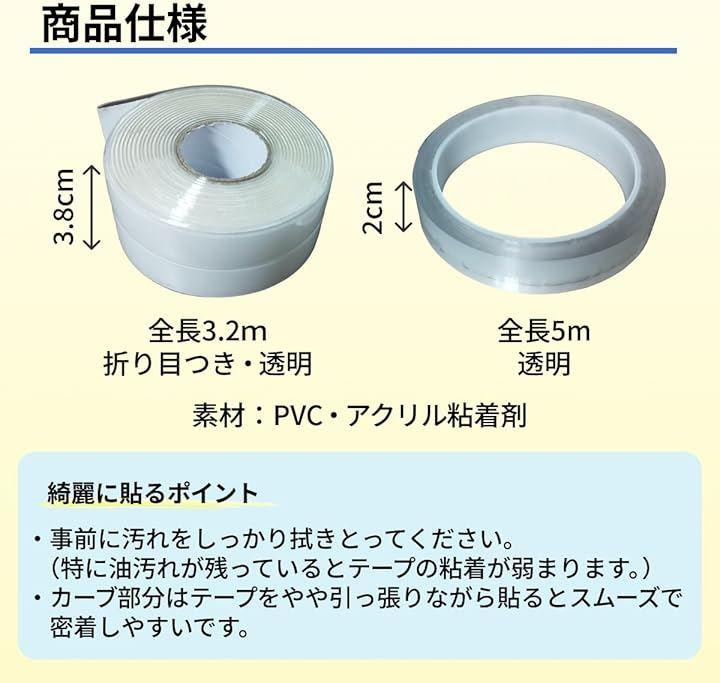 台所やコーナーのテープとして、防油性、耐熱性、掃除が簡単、防カビ、防汚、防塵、防水、防湿、強力な粘着性、ノリ跡が残らず、交換も簡単