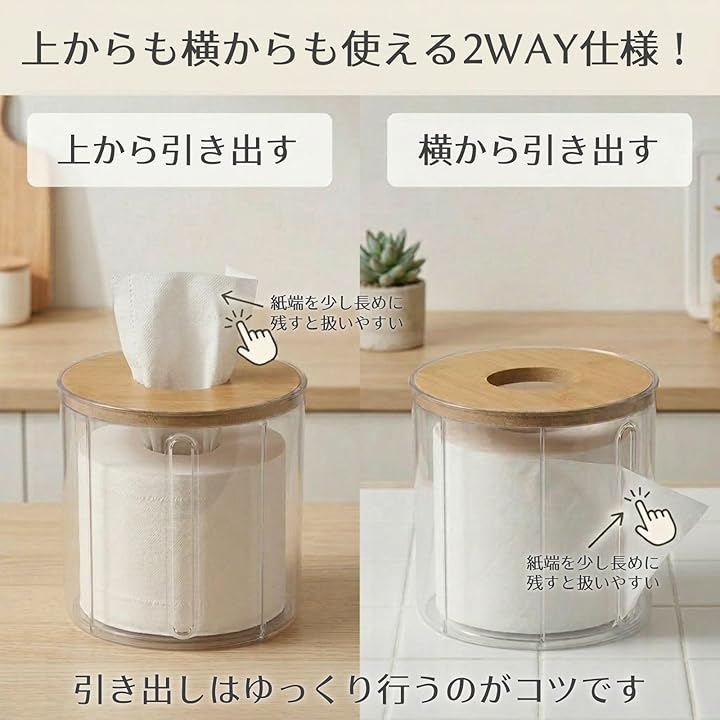 芯を抜いて中央からスムーズに取り出し 2WAY仕様ですので、トイレットペーパーの芯を取り外し、ロールの中央から引き出して使用できる中央引き出しタイプ。