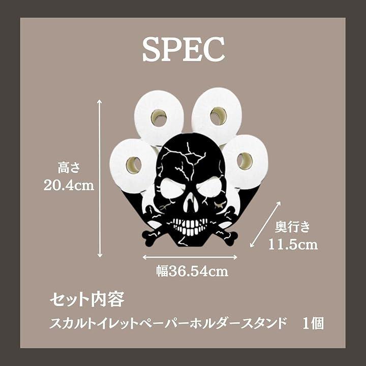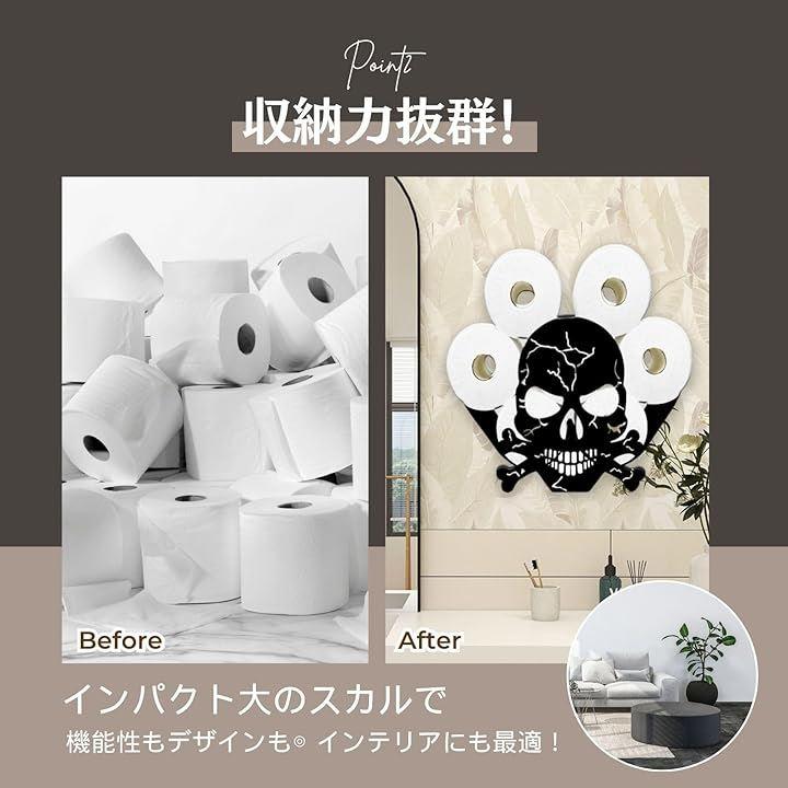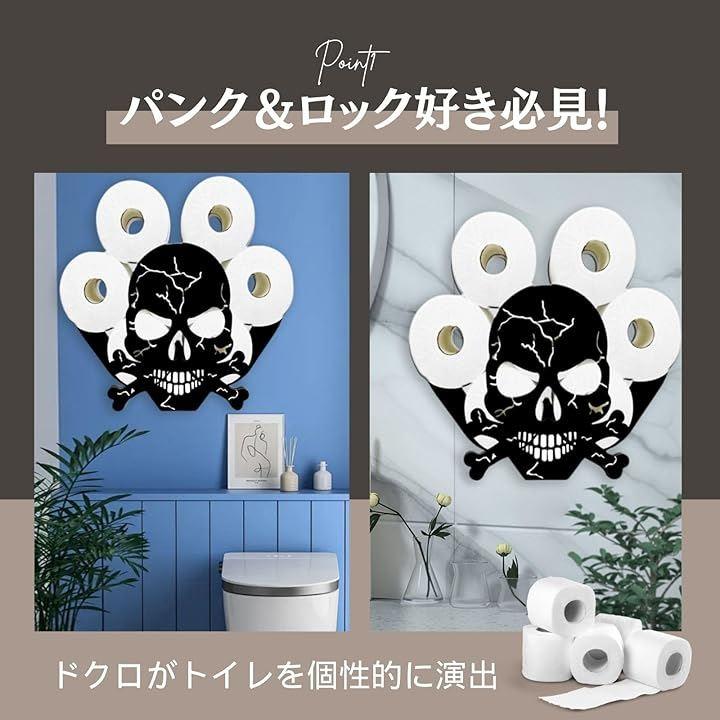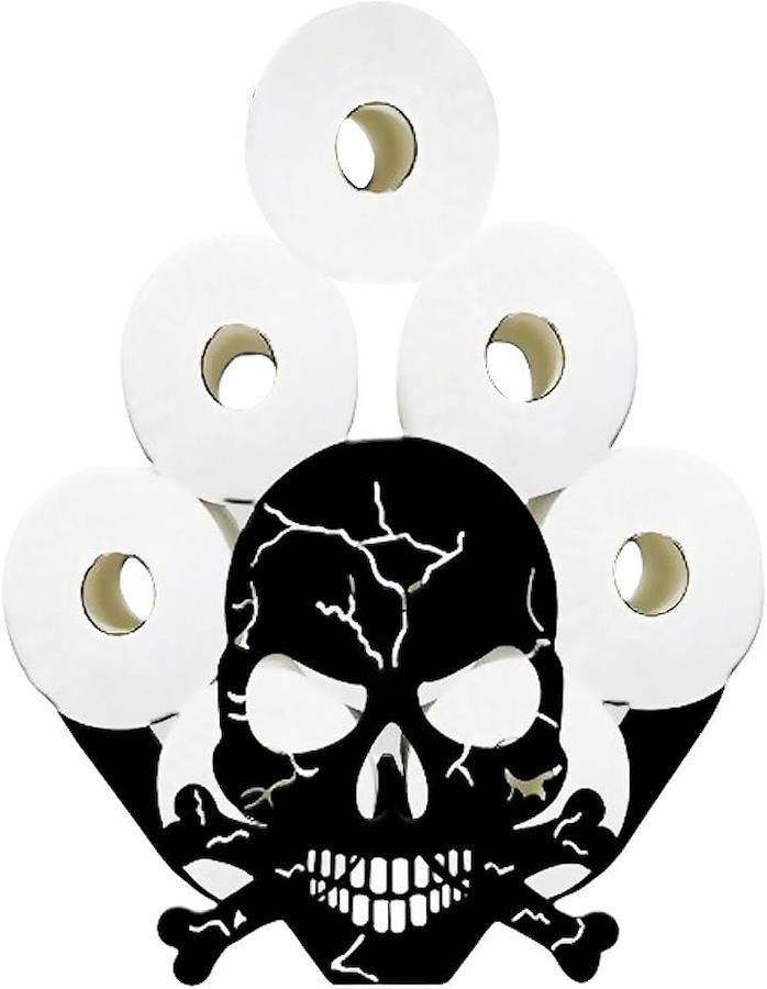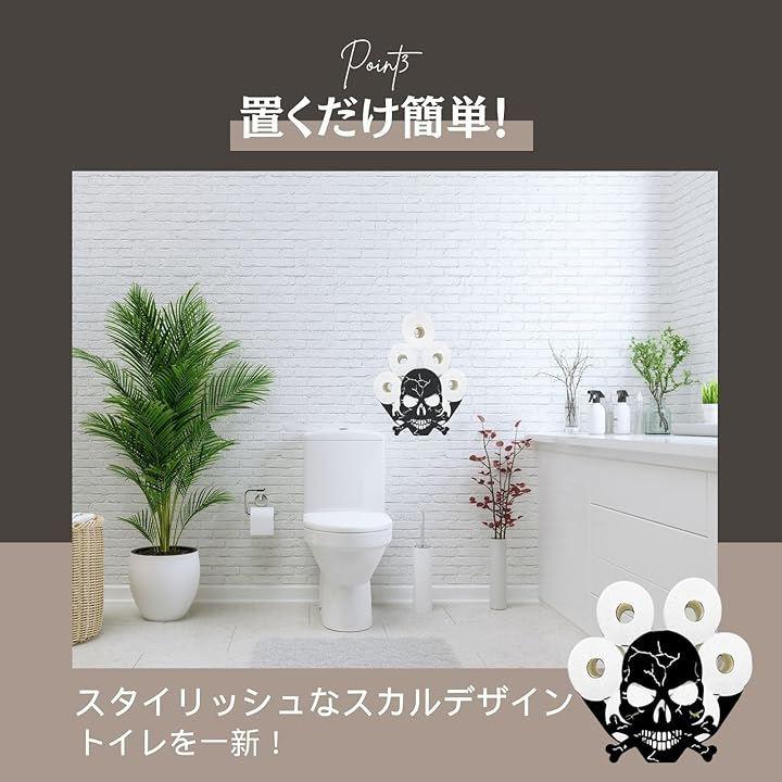スカルデザインのトイレットペーパー ストッカーがトイレをクールに演出:インパクト大のアイアン製のドクロのトイレットペーパーホルダーは、予備のトイレットペーパーをスタイリッシュに収納し、個性的な空間を演出します。