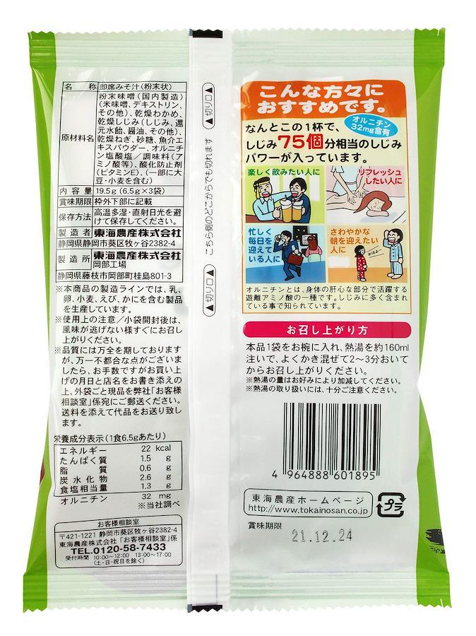 しじみの旨みたっぷりの美味しいしじみのみそ汁です。お手軽なのに本格派のみそ汁をご家庭でお楽しみください。粉末みそ使用。個包装1袋にしじみ75個分相当のオルニチンを配合致しました。オルニチンは身体の肝心な部分で活躍する遊離アミノ酸の一種です。しじみに多く含まれていることで知られています。