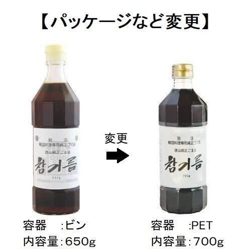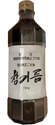 徳山純正ごま油(チャンギルム)150g卓上瓶 【名称】食用ごま油 煎ったごまを絞って抽出し、濃厚で香り高いごま油に仕上げました。数滴加えるだけでごまの香ばしい香りが広がり、韓国料理には欠かせない調味料です。 【食べ方】お鍋や炒め物、和え物、生食する際に最後に魔法の1滴です。 一般のごま油にない濃厚な香りと味わいをお楽しみいただけます。 ごま油に塩を入れて、焼肉を食べると絶品です。 ・開封後は、フタをして涼しく暗い場所に保存し、できるだけ1~2ヶ月以内にお召し上がりください。 ・冬季になると油が凍ることがありますが、あたためれば清澄になります。 ・韓国王室御用達レシピで香り高くコクのある最高級のごま油です。