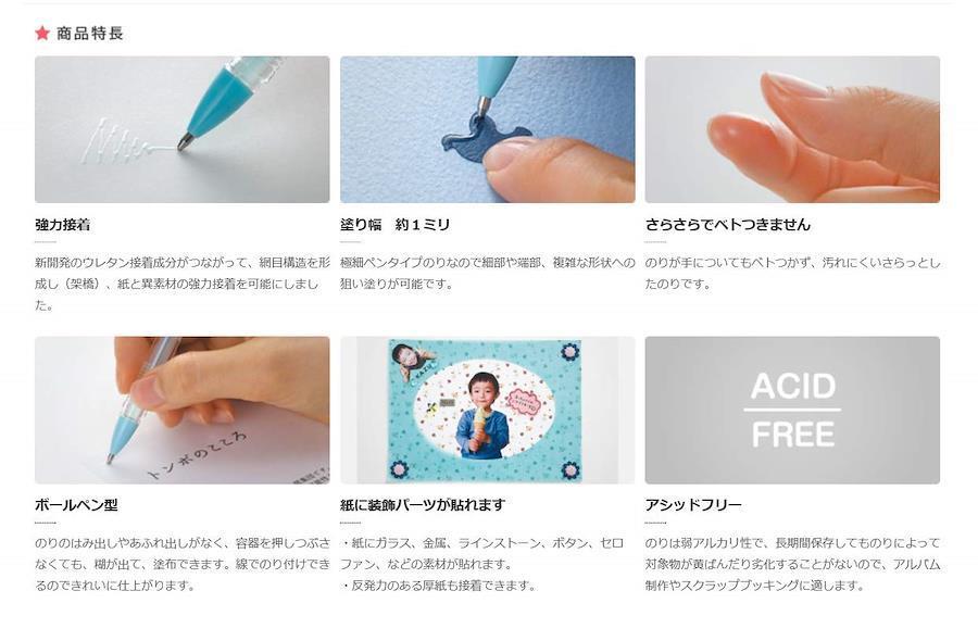細く、美しく、強く。紙と異素材を強力に接着できるペンのり「アクアピット強力ペンタイプ」。ボールペンと同じ形で書くように持ち、直径約1ミリから塗布できます。ラインストーンもガラスも金属も紙と紙以外の材料を新開発の架橋性ウレタン成分が強力に接着します。