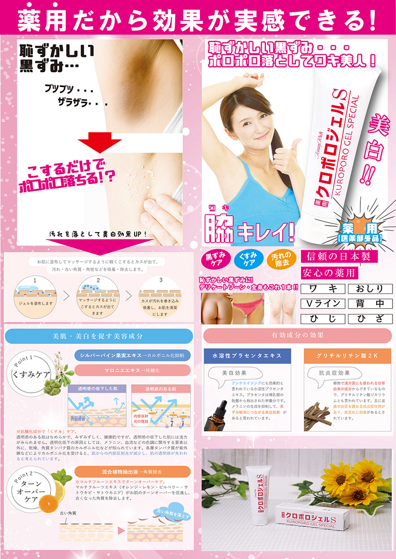 ★薬用だから効果が実感できます!*ピーリングタイプの黒ずみケア。*気になるブツブツやザラザラに、ポロポロケア。*薬用だから効果が実感できます。◇有効成分・水溶性プラセンタエキス:アイチエイジングにも効果的と言われている水溶性プラセンタエキス。プラセンタは哺乳類の胎盤から抽出された栄養分です。メラニンの生成を抑制して黒ずみ解消につながる美白効果があると言われています。・グリチルリチン酸2K:漢方薬にも使われる甘草由来の成分です。主に皮膚の炎症を鎮める抗炎症作用があり、肌荒れに効果があるとされています。