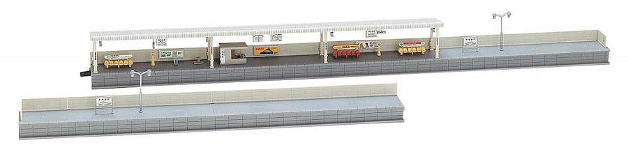 一般的な対向式ホームの近代型です。6つのブロックで構成され、ブロック間の接続はジョイナーによるワンタッチ式となっています。ホームの長さは、20m級車両5両分。時計、スピーカーなどは別パーツ構成で再現。駅名、広告板用のシールなど付属。延長部セット (別売)を使用し、延長できます。[4033]橋上駅舎 (別売)などを使用して高架化することもできます。