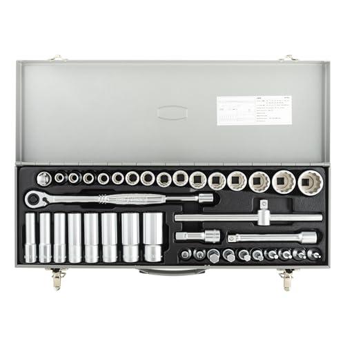 セット内容:ソケット(12角)4D-10、11、12、13、14、16、17、18、19、21、22、24、27、30、32、ディープソケット(12角)4D-12L、13L、14L、17L、19L、21L、24L、30L、ヘキサゴンソケット4H-03、04、05、06、08、10、12、14、ドライバービットソケット4H-P2、M2、ラチェットハンドル(ホールドタイプ)RH4H、T形スライドハンドルSL40、エクステンションバー320(75mm)、321(150mm)、407(250mm)、ボールジョイントBJ40、メタルケースMC200A