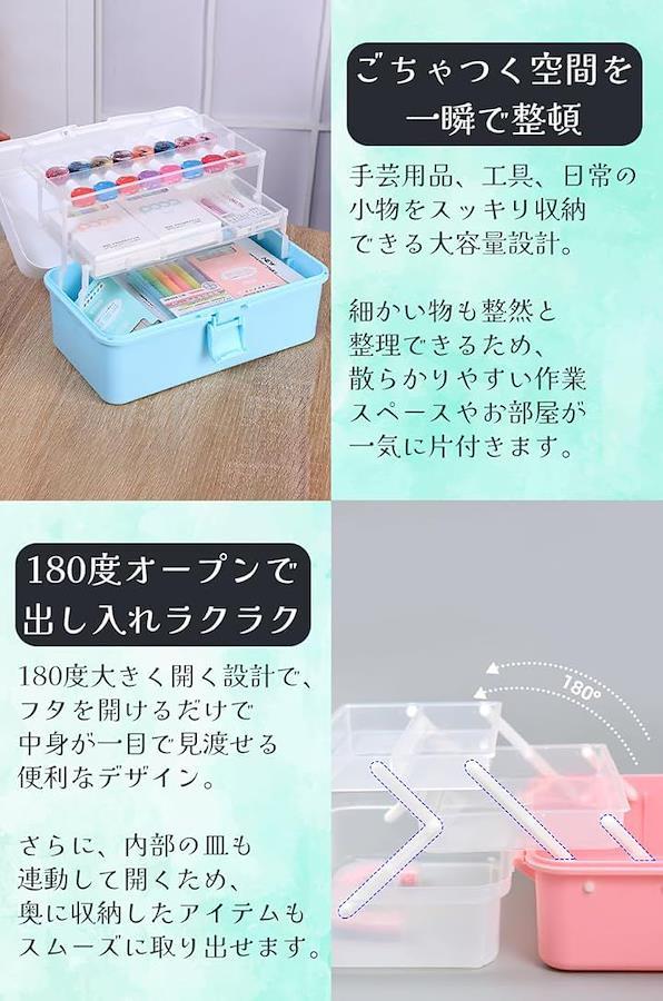 「大容量収納」手芸用品や日常の小物、そしてちょっとした道具まで、たくさんのアイテムを整然と収納できるツールボックスです。