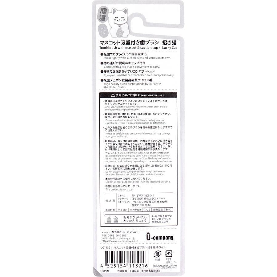 【ご使用上の注意】・使用後は流水で十分に洗い水分を切ってよく乾かした後、キャップをかぶせてください。・塩素系殺菌剤、漂白剤、熱湯、精油は使用しないでください。変色、変形の恐れがあります。・力の入れ過ぎは歯ぐきやブラシを傷める原因になりますのでご注意ください。・吸盤部分と取り付け場所の埃・汚れなどをきれいに拭き取ってから取り付け使用してください。・凹凸のある面、ザラザラした面などは取り付けられませんのでご注意ください。取り付け場所により吸盤の貼付き持続時間が多少異なります。・直射日光、火気の近くや高温になる場所には置かないでください。 変形変質の恐れがあります。・本来の用途以外に使用しないでください。・本品はおもちゃではありません。・毛先がひらいたらとりかえましょう。