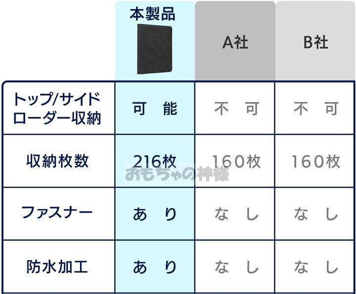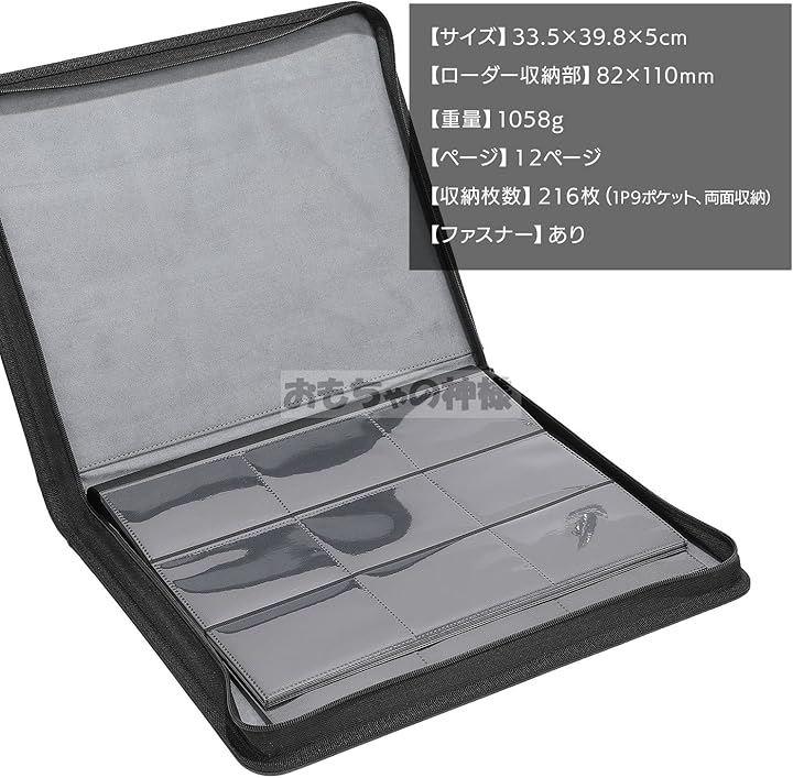 「サイズ」33.5x39.8x5cm 「ローダー収納部」110x82mm 「重量」1058 g 「ページ」12ページ 「収納枚数」216枚(1P9ポケット、両面収納) 「ファスナー」あり