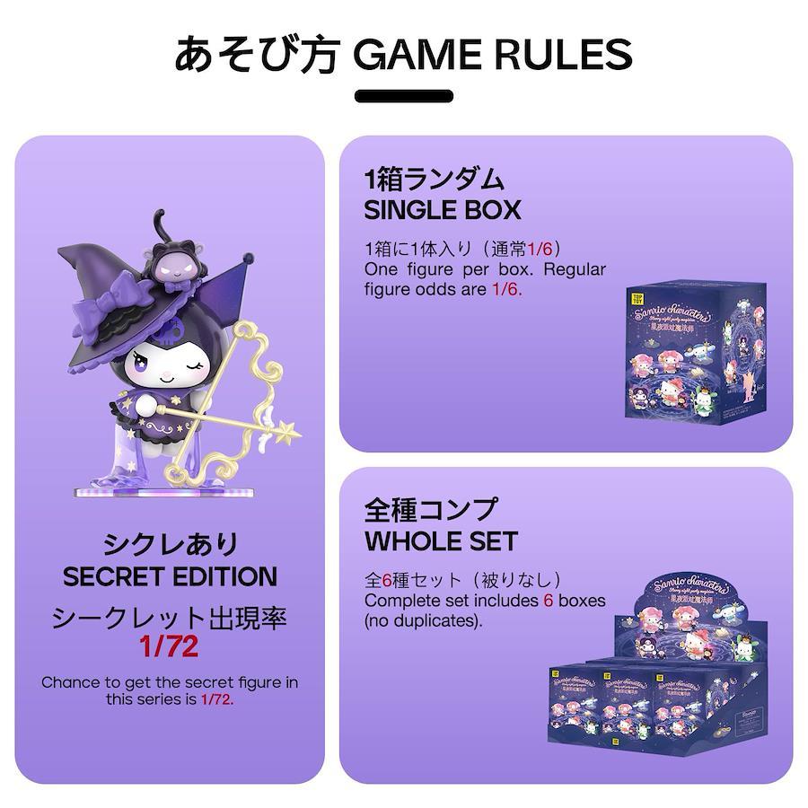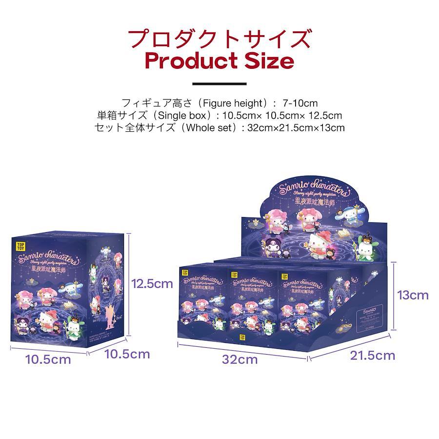 【サンリオ×TOP TOY 星夜パーティーシリーズ登場】クロミやマイメロディをはじめとする人気サンリオキャラクターズが、星降る夜の魔法使いに変身!幻想的な星夜をテーマにしたブラインドボックス【ガチャガチャ】フィギュア。【幻想的な魔法テーマ&カラフルな魔法衣装】各キャラクターはそれぞれ異なる魔法能力を持つ魔法師としてデザインされており、衣装も華やかで個性的。魔法陣モチーフの台座や小物アクセサリーも付属し、飾るだけでファンタジーな世界観を演出できます。【PU光沢&グラデーション塗装で高級感演出】ボディにはPU光油や特殊スプレー塗装が施され、繊細なグラデーションが光を受けて美しく輝きます。ソフビとPVCを組み合わせた素材で、手に持ったときのしっかりとした質感も魅力のひとつです。【存在感あるサイズ/豊富な表情とポーズ】フィギュアサイズは約7~10cmで、卓上や棚に飾るのに最適。各キャラクターは動きのあるポーズと、魔法を操るような生き生きとした表情で、見るたびに物語が浮かぶようなデザインに仕上がっています。【ギフトにも◎ コレクター心をくすぐる1ピース】誕生日プレゼントやサプライズギフトとしても人気。コレクター向けの高品質ガチャガチャとして、シリーズで集めたくなる魅力たっぷり!