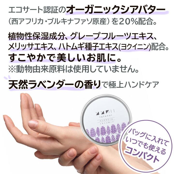 【こだわりポイント】エコサート認証 オーガニック シアバター 20%配合、しっとり 手肌に。しっかり保湿しつつ、べたつかないハンドクリーム。ネイルもつやつやに仕上げます。最後まで使い切れるコンパクトなアルミジャー入り。アルコール消毒による手荒れが気になる方に。お肌に優しい無添加(合成香料、着色料)。天然ラベンダー精油のナチュラルな香りでリラックス効果も