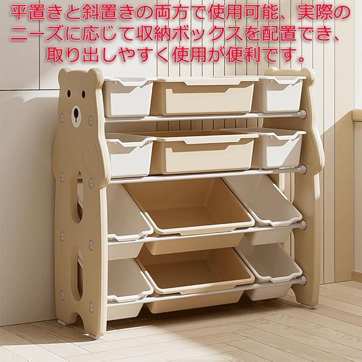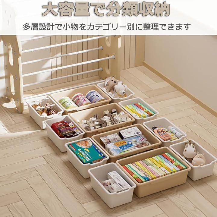 「多層の大容量分類収納」複数の収納ボックスが配置されており、ブロック、絵本、ぬいぐるみなどおもちゃをカテゴリー別に整理できます。