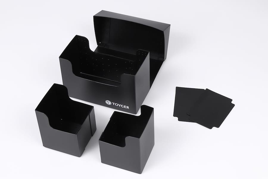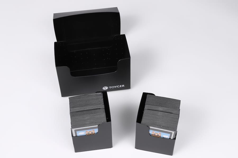 通常1-5営業日で発送【新品未開封品】入れ子式の「超万能」大容量デッキケース ・プラスチックで軽量 ・どんなカードタイトルでも、誰でも使える「ちょうどいいサイズ」 ・大容量なのに小回りが効き使いやすい ・1ブロックに入る量は2重スリーブで100枚程度、合計で200枚ほど収納可能 ・セパレーター2枚付属で、60枚x4ブロックに分けることも可能 ・ケースinケース構造により、対戦時の取り出しの手間が激減 ・対戦用小物ケース(TOYGER RollTray)やローダーも収納可能 [収納枚数] スリーブなし:140枚 1重スリーブ:125枚 2重スリーブ:105枚 3重スリーブ:80枚 ※枚数は目安です [付属品] ・ケース(外側)1個 ・ケース(内側)2個 ・セパレーター 2枚