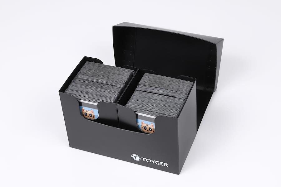 入れ子式の「超万能」大容量デッキケース・プラスチックで軽量 ・どんなカードタイトルでも、誰でも使える「ちょうどいいサイズ」 ・大容量なのに小回りが効き使いやすい・1ブロックに入る量は2重スリーブで100枚程度、合計で200枚ほど収納可能 ・セパレーター2枚付属で、60枚x4ブロックに分けることも可能・ケースinケース構造により、対戦時の取り出しの手間が激減 ・対戦用小物ケース(TOYGER RollTray)やローダーも収納可能[収納枚数] スリーブなし:140枚 1重スリーブ:125枚 2重スリーブ:105枚 3重スリーブ:80枚 ※枚数は目安です [付属品] ・ケース(外側)1個 ・ケース(内側)2個 ・セパレーター 2枚【免責事項】メーカーによる商品リニューアルに伴いパッケージが変更が行われた場合、新パッケージでお届け致します事ご了承願います。