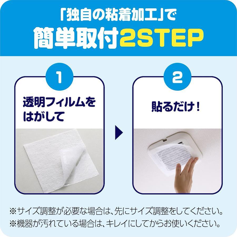 粘着タイプのフィルターなので、取付けがシールのように簡単に行えます。 抗カビ&抗菌加工不織布を使用しています。 フィルターが汚れたら浮き出る交換お知らせサイン付き。(機種または使用状況によっては浮き出ない場合があります。)