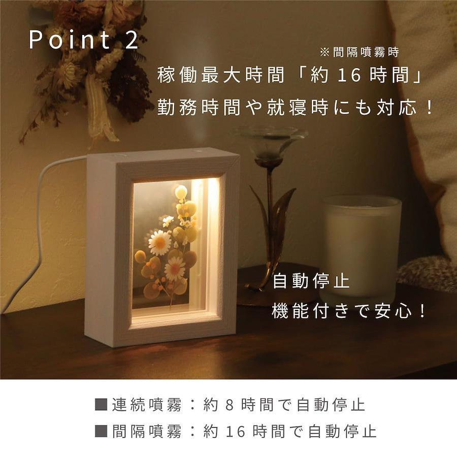 【Point2】稼働最大時間「約16時間」勤務時間や就寝時にも対応した小型加湿器です。 ※間隔噴霧時自動停止機能付きなので寝室での使用時に消し忘れても安心してお使いいただけます。