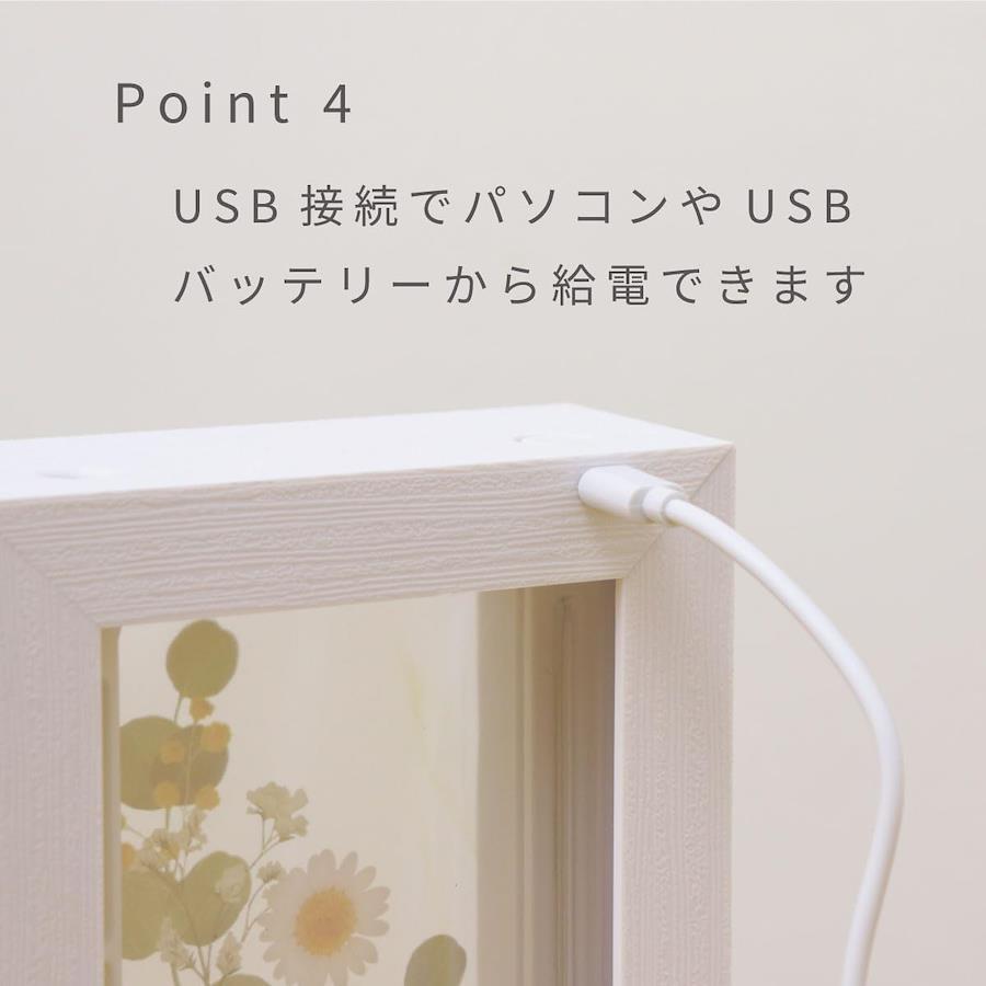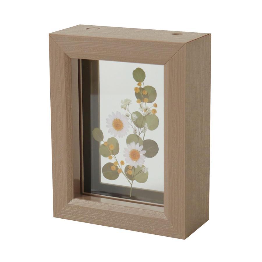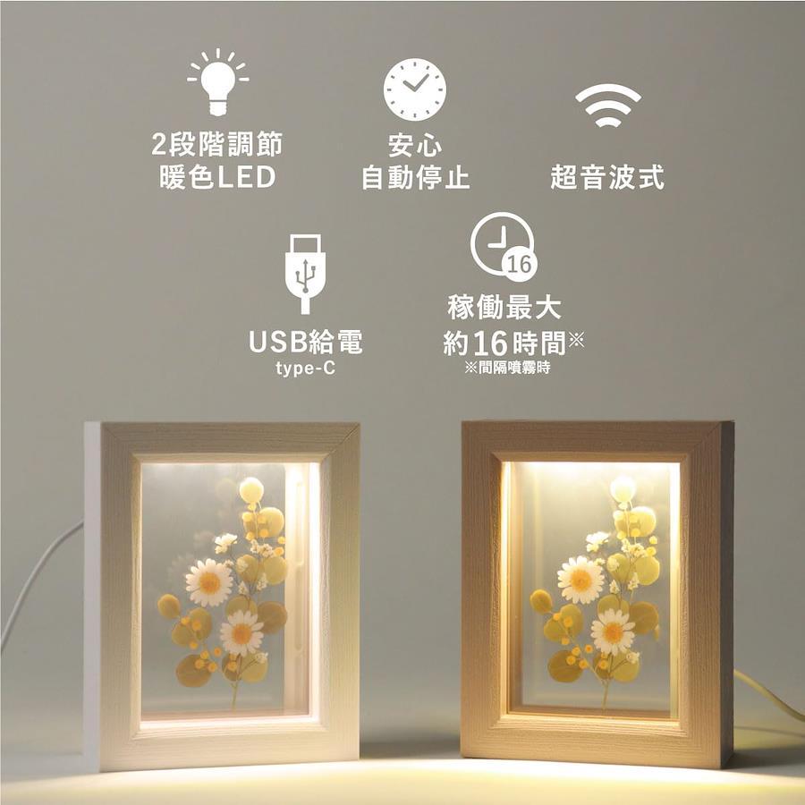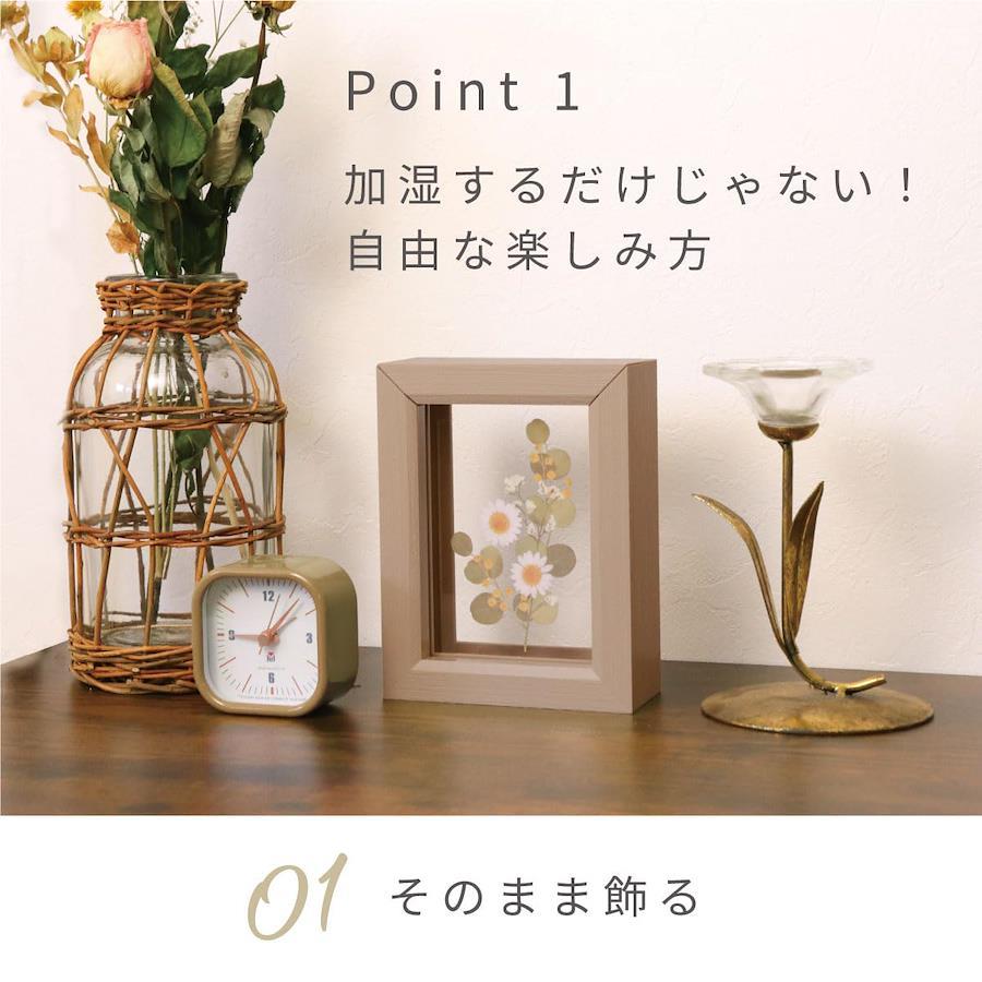 01、そのまま飾るフレームにドライフラワーのクリアカードが入った加湿器。お部屋になじむナチュラルなデザインです。