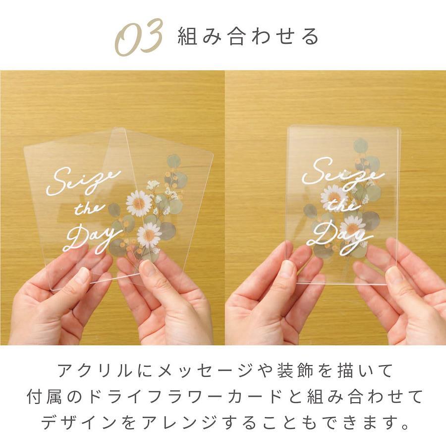 03、組み合わせるアクリルにメッセージや装飾を描いて付属のドライフラワーカードと組み合わせて、デザインをアレンジすることもできます。イラストカードと合わせて楽しむことができます!