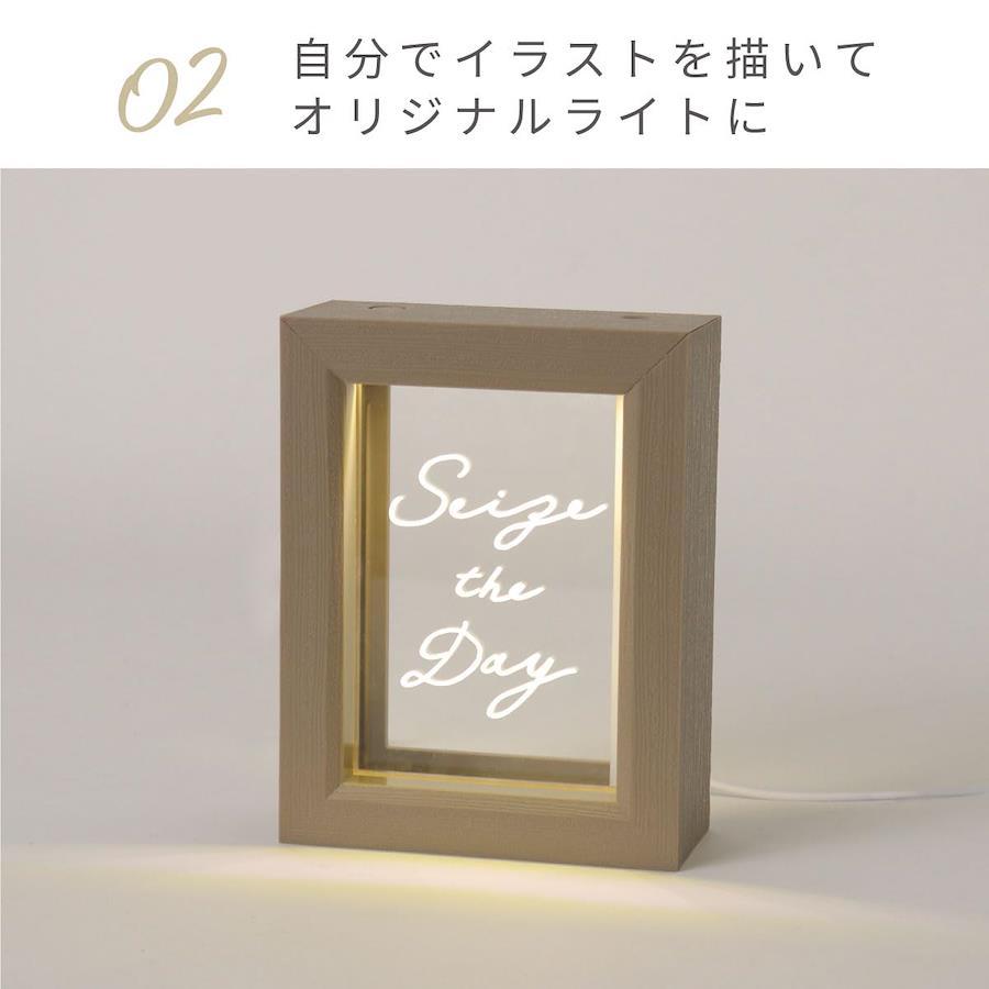 02、自分でイラストを描いてオリジナルライトにお持ちのブラックボードマーカーでアクリルに好きな絵を描いてフレームに飾ることができます。光が絵にあたって優しく光ります※取扱説明書にはサンプルデザイン付き!※ブラックボードマーカーは付属しておりません。