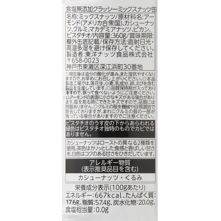 特選ナッツのみで配合されたミックスナッツ缶「クラッシー」食塩無添加バージョン持ち味の違う6つのナッツのミックスバランスが最高になる様工夫を凝らしました。食塩を一切加えない、ナッツ本来の味を楽しんでいただける。通好みの本格ミックスナッツ缶! ※ピーナッツは入っておりません。