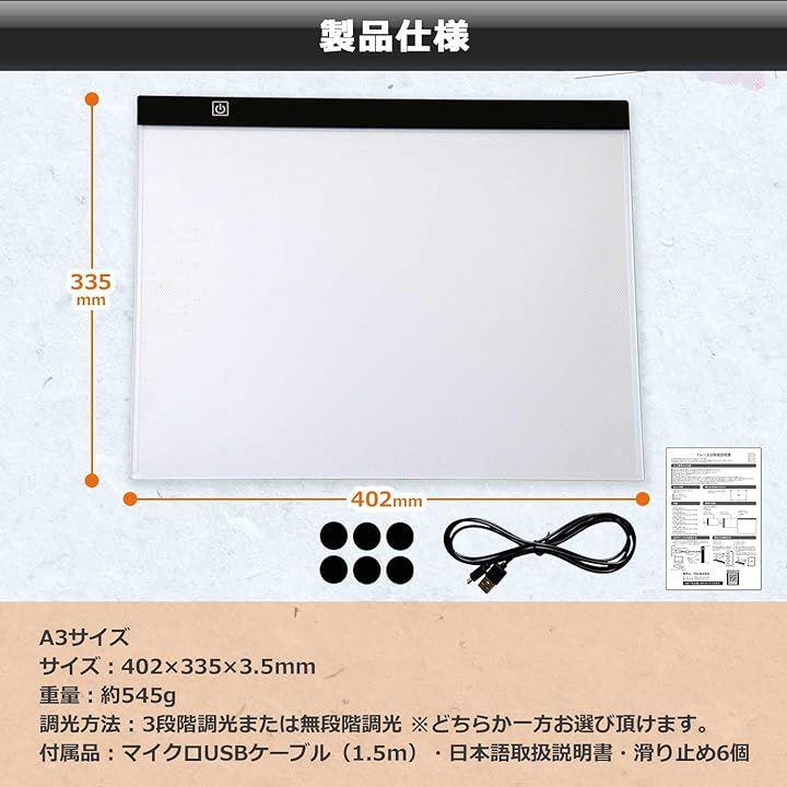 「製品仕様」サイズ:402x335x3.5mm 重量:約545g 調光方法:3段階調光または無段階調光 *どちらか一方お選び頂けます。