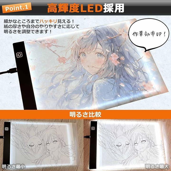 「ポイント1 高輝度LED採用」細かなところまでハッキリ見える。紙の厚さや自分のやりやすさに応じて明るさを調整できます。