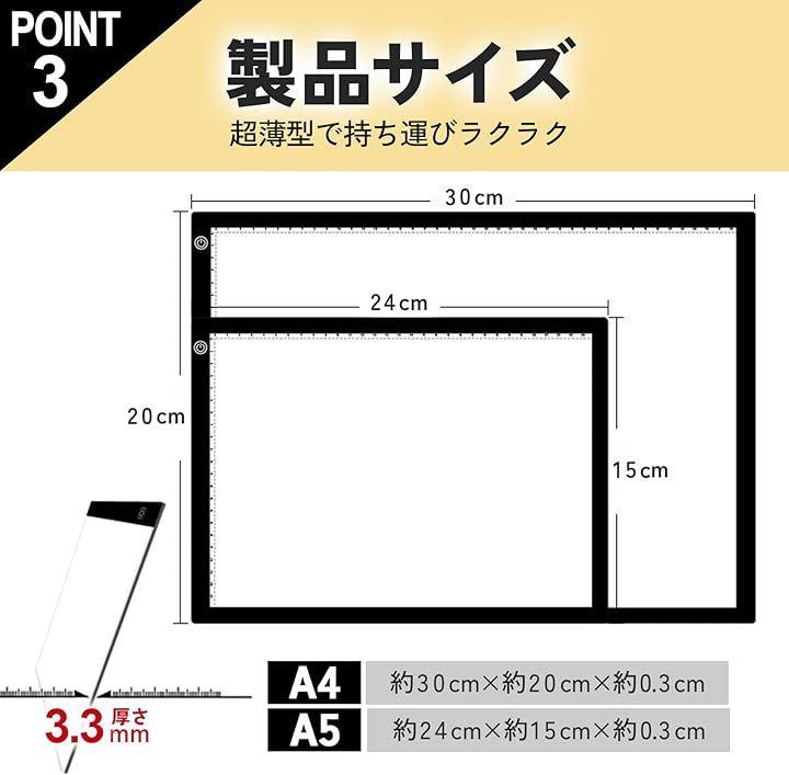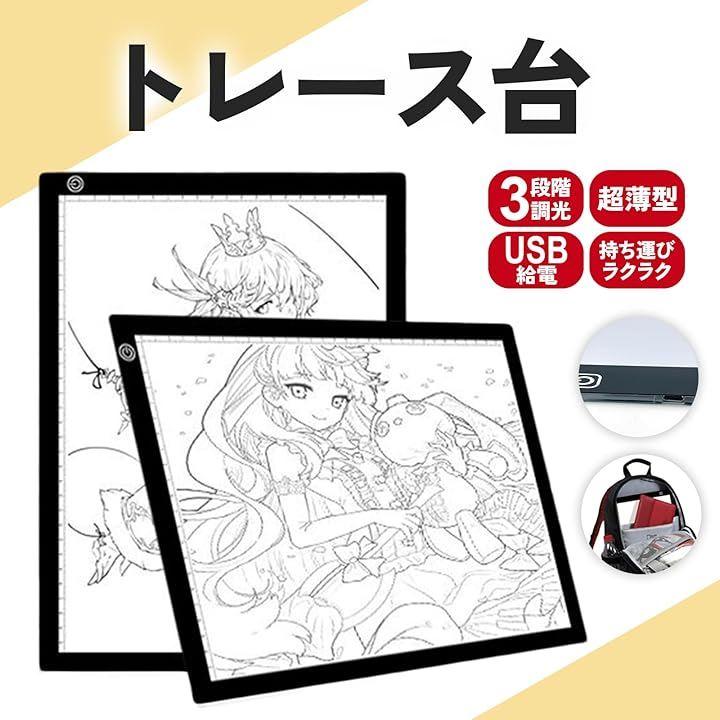 「商品詳細」A5サイズ:幅150mm 長さ240mm 厚さ3.3mm A4サイズ:幅200mm 300mm 厚さ3.3mm このトレース台は、アニメや漫画のイラストをトレースするのに最適で、イラスト練習におすすめです。