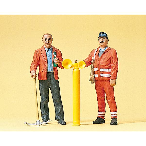 track worker, safety guard保線作業員へ、ボンベ型のサイレンと鐘を使って危険を知らせる安全管理者の人形 2体セットです。