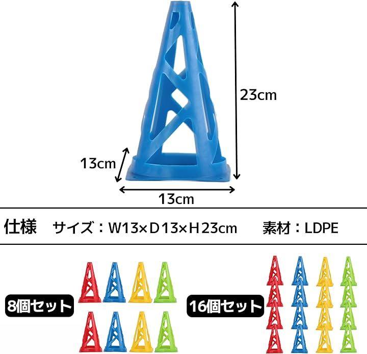 「仕様」サイズ:W13xD13xH23cm、素材:LDPE セット内容:コーン4色(赤、青、緑、黄色)x4コ 計16コセット