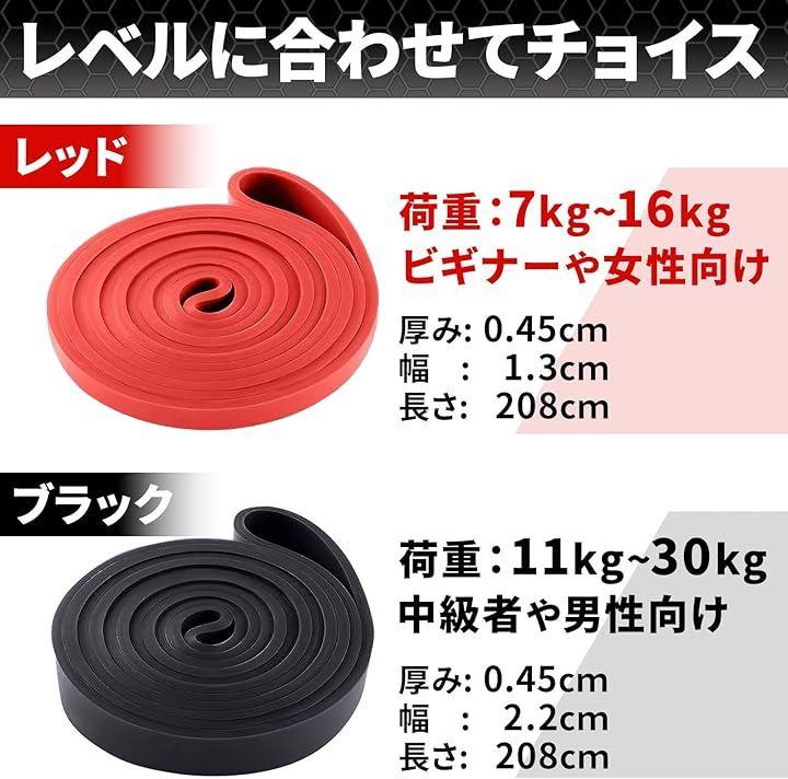 レッドバンド: 長さ208cm、幅1.3cm、厚さ0.45cm、抵抗値15~35ポンド(約7~16kg)、初心者向け、女性や軽いトレーニングに最適