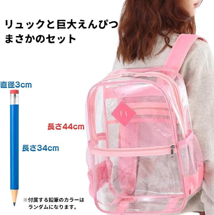 巨大えんぴつ付き透明リュック:インパクト抜群の巨大えんぴつ小物が付いた、まる見えデザインのクリアリュック。