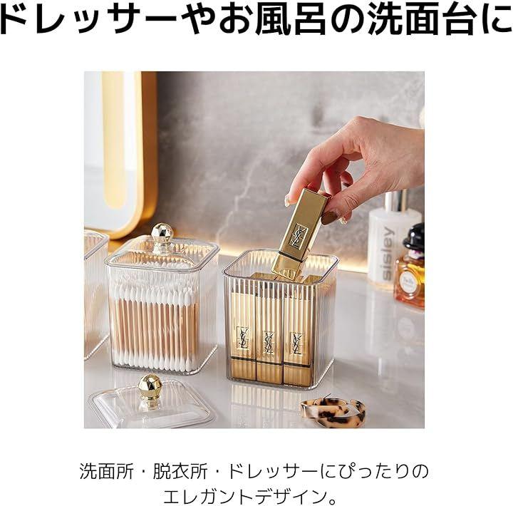 「透明デザインで中身がひと目で分かる」 クリアな透明ボディにより、収納した綿棒・コットン・ヘアゴム・化粧品小物などが一目で確認可能。